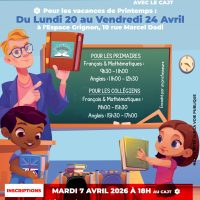 Nous proposons pour les primaires et collégiens de Thiais: Un stage en mathématiques et français ainsi qu’un stage d’anglais pendant la 1ère semaine des vacances de Printemps 2026 encadré par un professeur – 10€ le stage. Du Lundi 20 au Vendredi 24 Avril 2026, les créneaux sont répartis entre primaires et collégiens. Le stage se Lire plus …