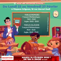 Nous proposons pour les primaires et collégiens de Thiais: Un stage en mathématiques et français ainsi qu’un stage d’anglais pendant la 1ère semaine des vacances d’Hiver 2026 encadré par un professeur – 10€ le stage. Du Lundi 23 au Vendredi 27 Février 2026, les créneaux sont répartis entre primaires et collégiens. Le stage se déroulera Lire plus …